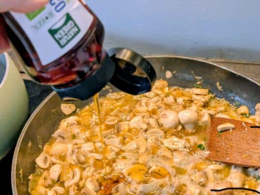 - lépés: Ha az ízek szépen kezdenek összeérni, a leve szép lassan elfő a gombának, akkor adjuk hozzá az 1 ek. édesítő, karamellizáló ízt méz vagy kókusz szirup formájában.