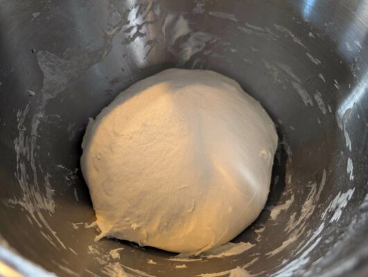 - lépés: Az összes hozzávalót dagasztógéppel vagy kézzel összedolgozzuk, ha túl ragadós még adunk hozzá lisztet. ( A képen látható állagot kell kapjuk.)