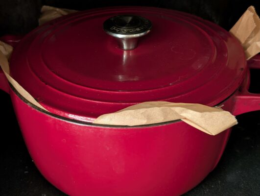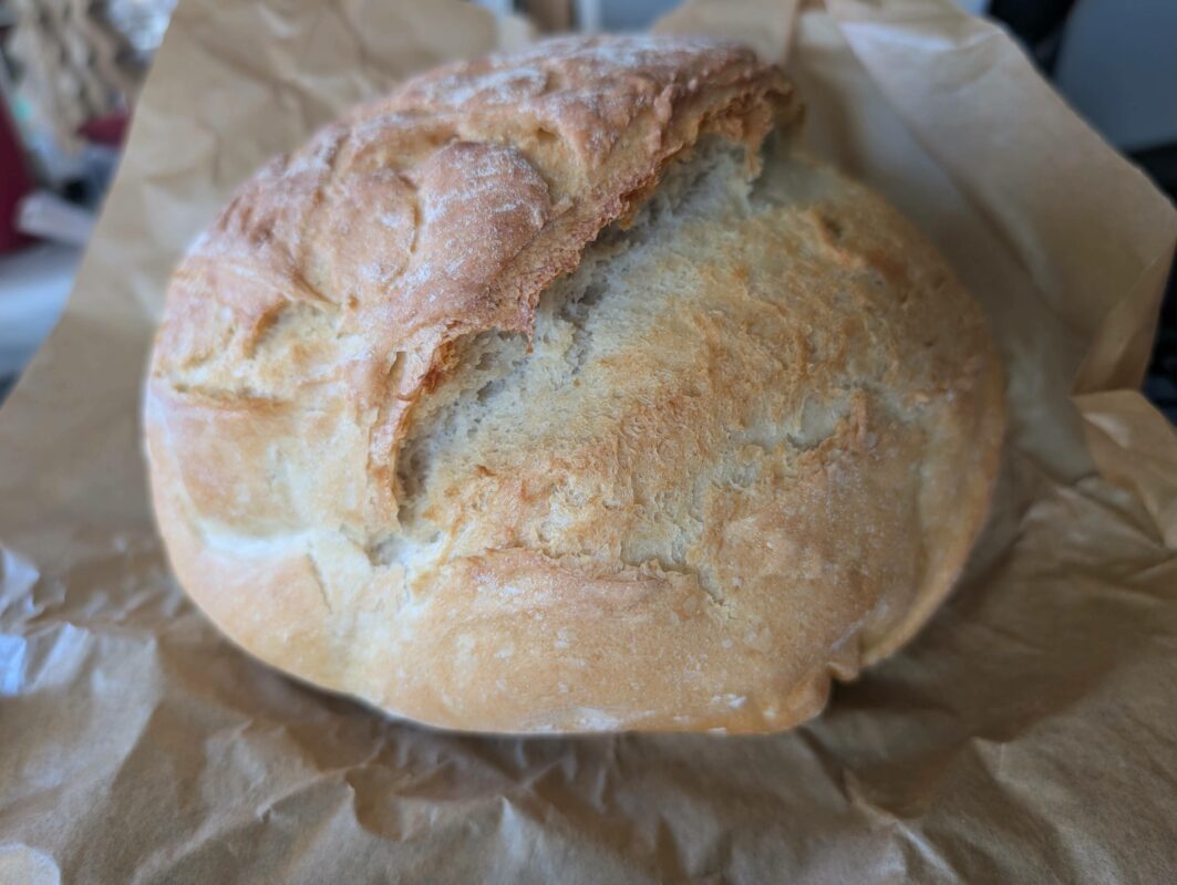 - lépés: A kenyér tetején éles késsel bemetszést ejtünk, sütőpapírral együtt a vaslábasba helyezzük.