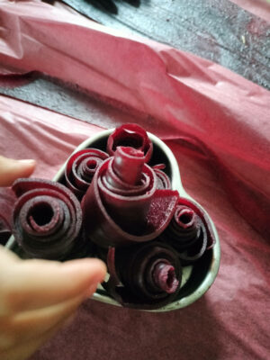 - Miután megszilárdult, könnyen fel lehet szedni a sütőpapírról, pizzavágóval 2-3 cm csíkokra vágjuk és feltekerjük.