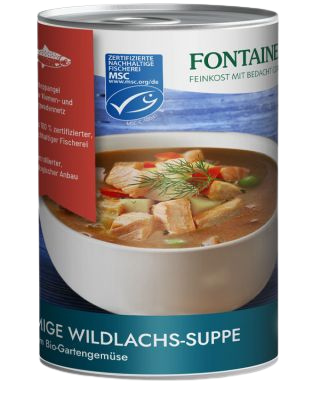 Összetevők: víz, vadlazac-filé (Oncorhynchus spp.) (20%), napraforgóolaj, zöldségek változó arányban (7,5% – *zöldborsó, *kaliforniai paprika, *zeller), *tejszín, *paradicsompüré, *nádcukor, tengeri só, *fűszerek, sűrítőanyag: *guargumi, *citromlé-sűrítmény.
