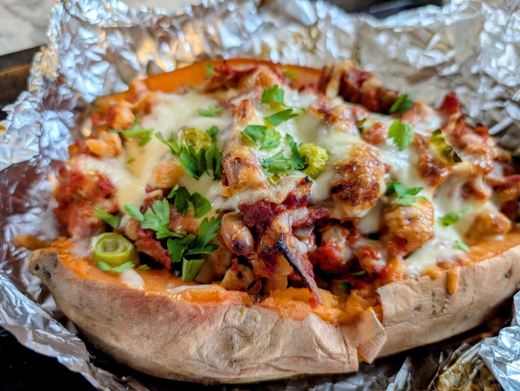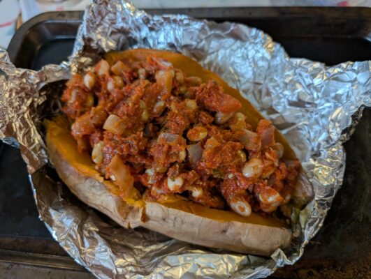 - lépés: Az édesburgonyát megmossuk és alufóliába csomagolva 180 °C-os sütőben kb. 40 percig sütjük.