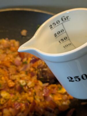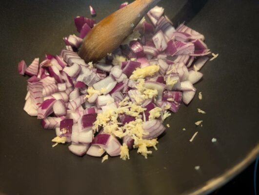 - lépés: Meghámozzuk a hagymákat, a lilahagymát apró kockákra vágjuk, a fokhagymát hozzá reszeljük és az olivaolajon sóval, borssal megdinszteljük.