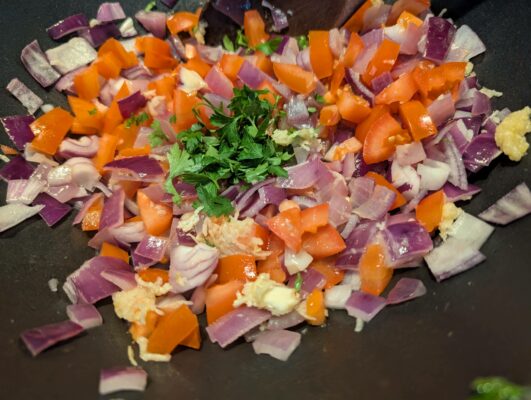 - lépés: Hozzáadjuk a felkockázott paradicsomot, az apróra vágott petrezselymet és az olaszos fűszereket is.