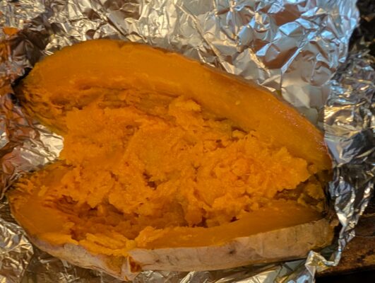 - lépés: A megpuhul édesburgonyát felül hosszában bevágjuk, villa segítségével kicsit megnyomkodjuk a húsát.